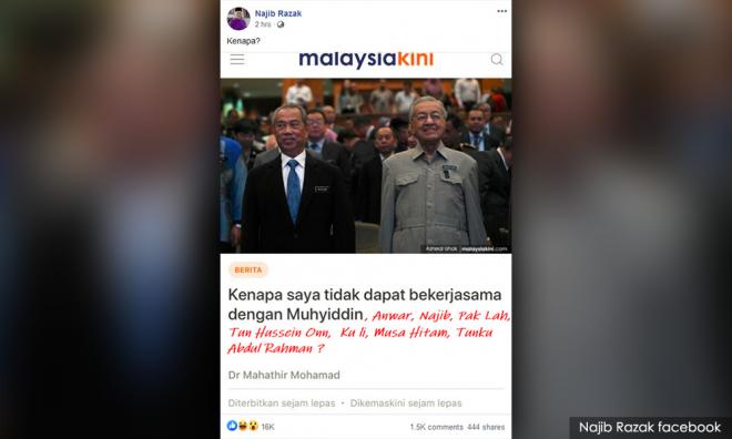 Najib dengan sinis memuat naik tangkap layar artikel disiarkan Malaysiakini dengan kapsyen "kenapa" merujuk kepada bekas perdana menteri keempat dan ketujuh itu.